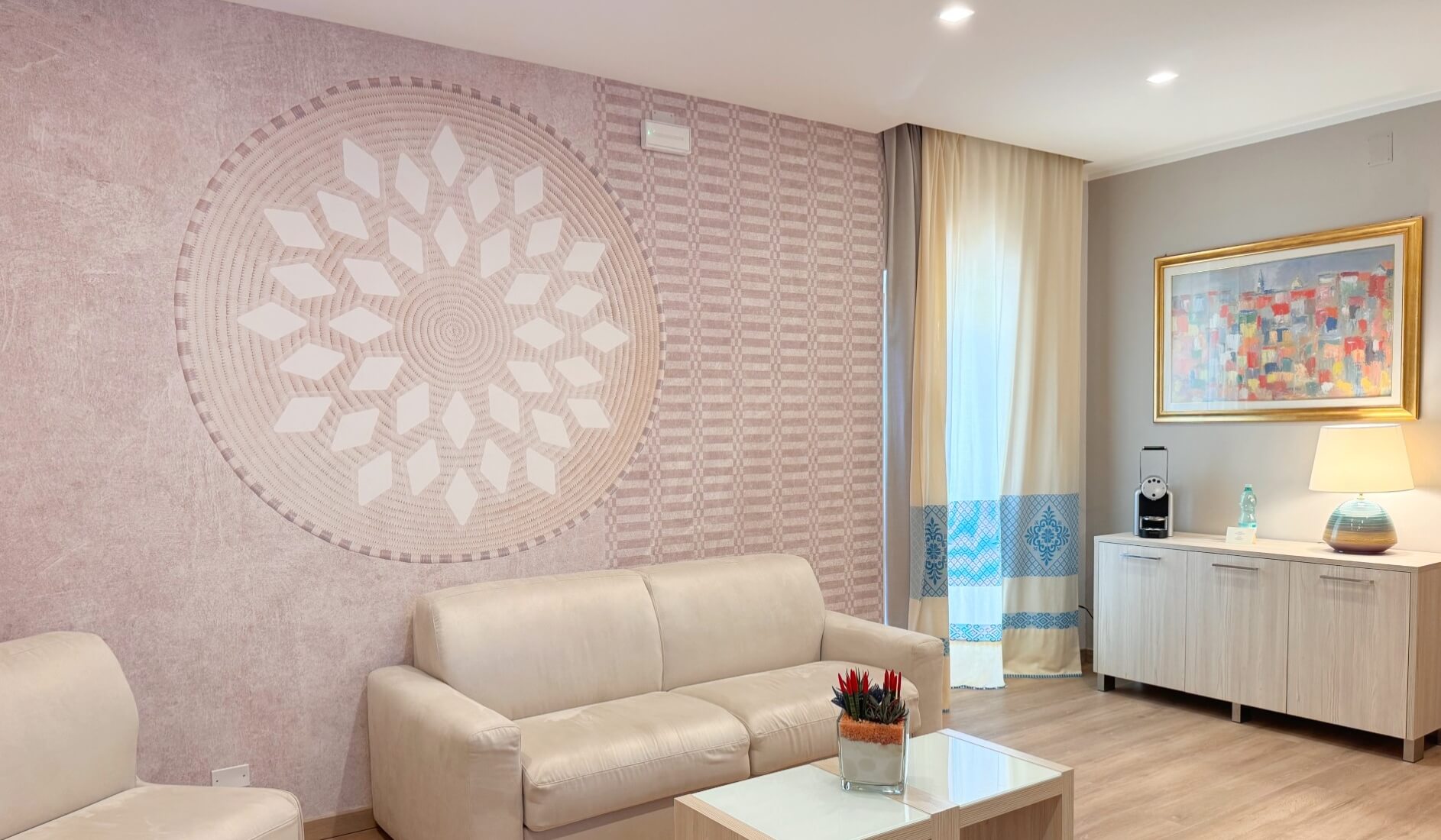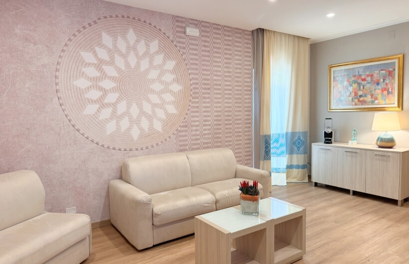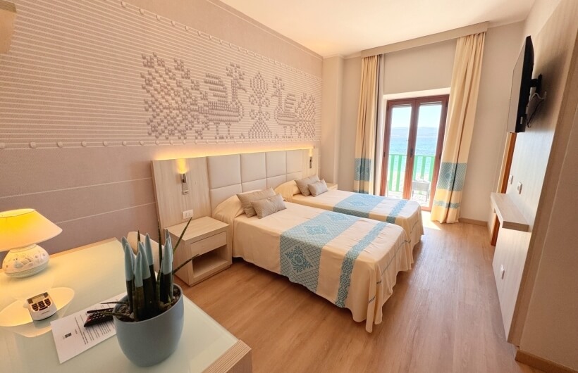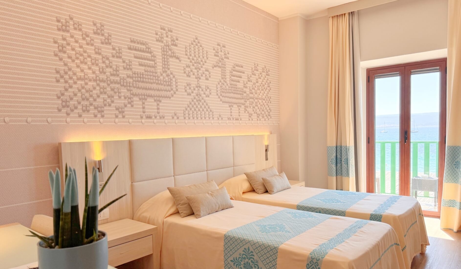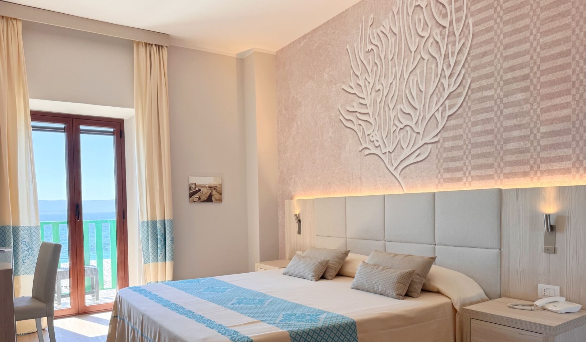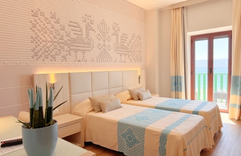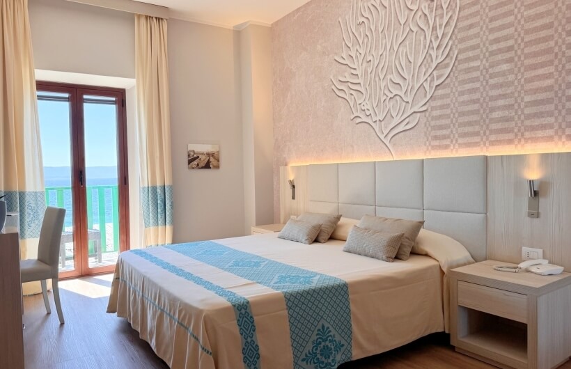 Splendid suite with sea view, composed of a single and welcoming living room and two independent bedrooms with bathrooms and small balconies each. Panoramic view of the Gulf of Alghero.