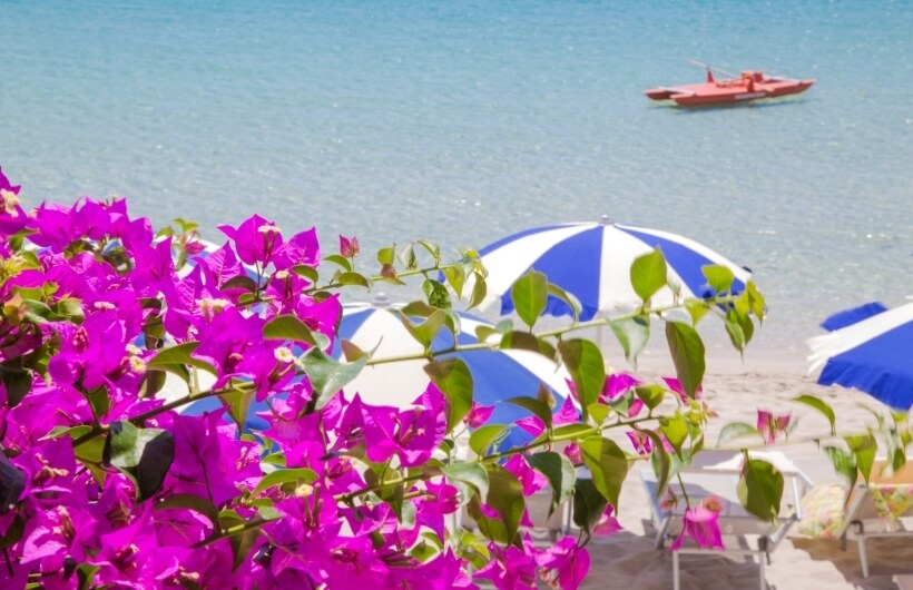 Der halbmondförmige Strand Le Bombarde ist aus feinstem Sand, im Süden von rötlichem, von Macchia umgebenem Vulkangestein abgegrenzt und im Norden vom Privatstrand des Hotels dei Pini.
