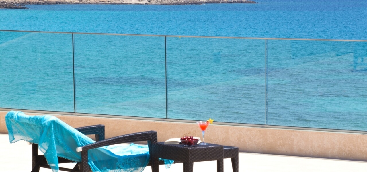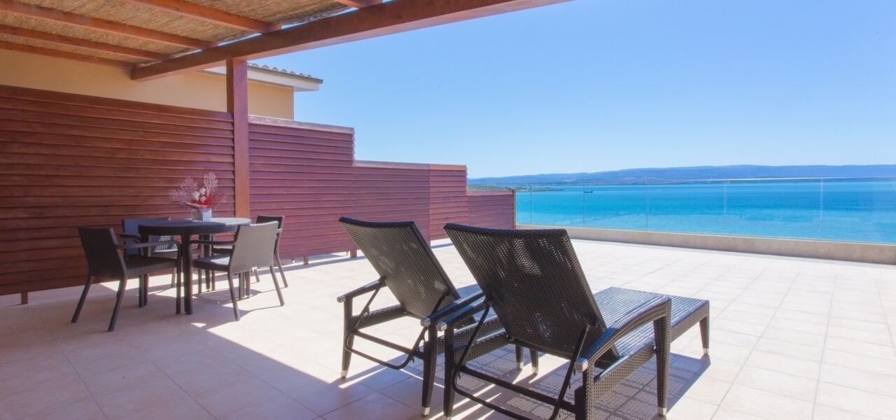 On the first floor, on the sea-facing side, along with the private veranda, certain rooms also have access to a large shared solarium, featuring rattan sun loungers.