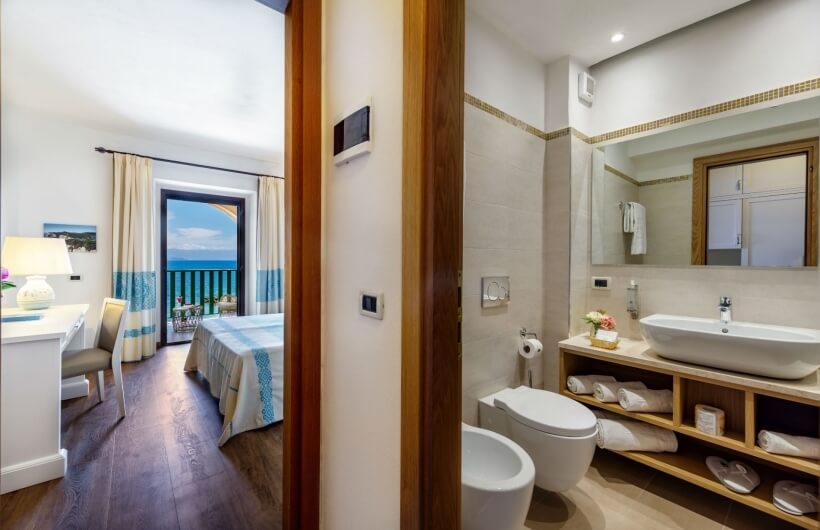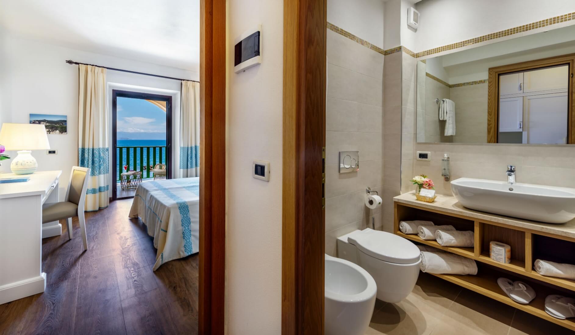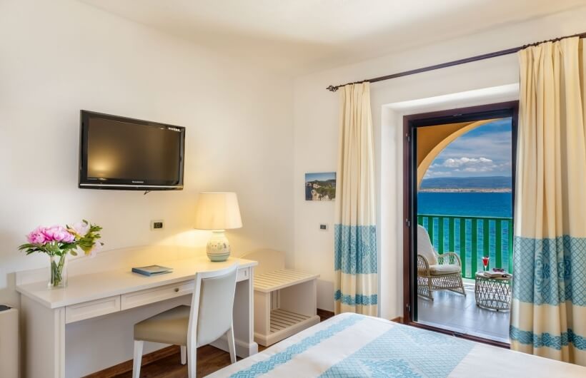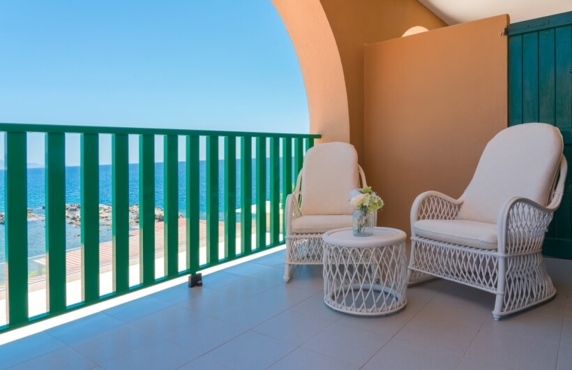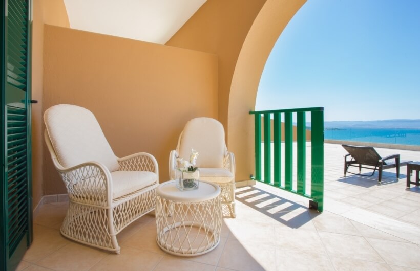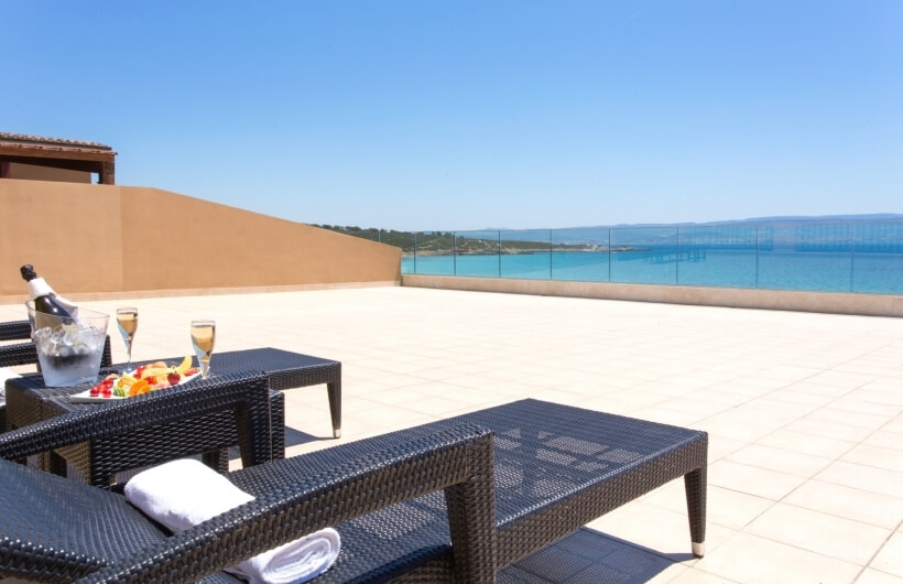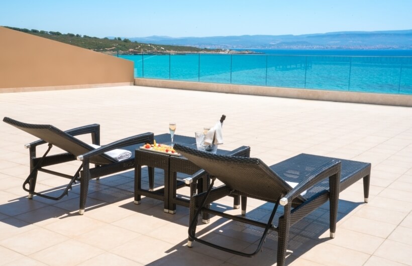 On the first floor, on the sea-facing side, along with the private veranda, certain rooms also have access to a large shared solarium, featuring rattan sun loungers.