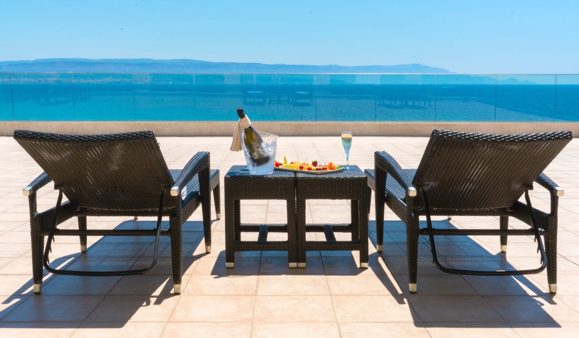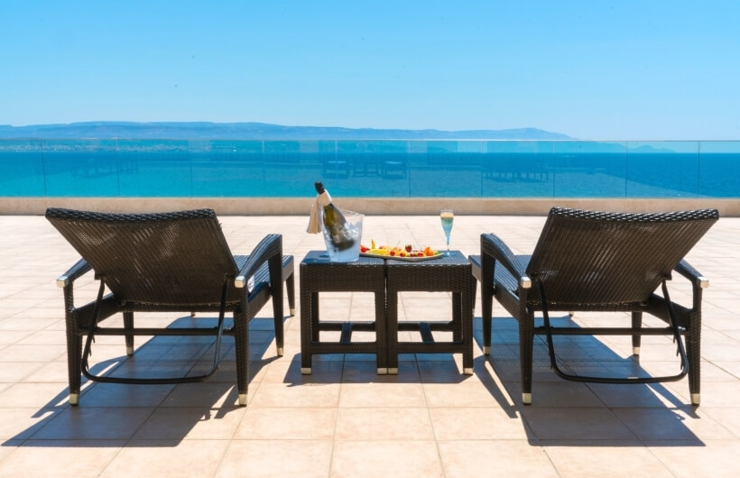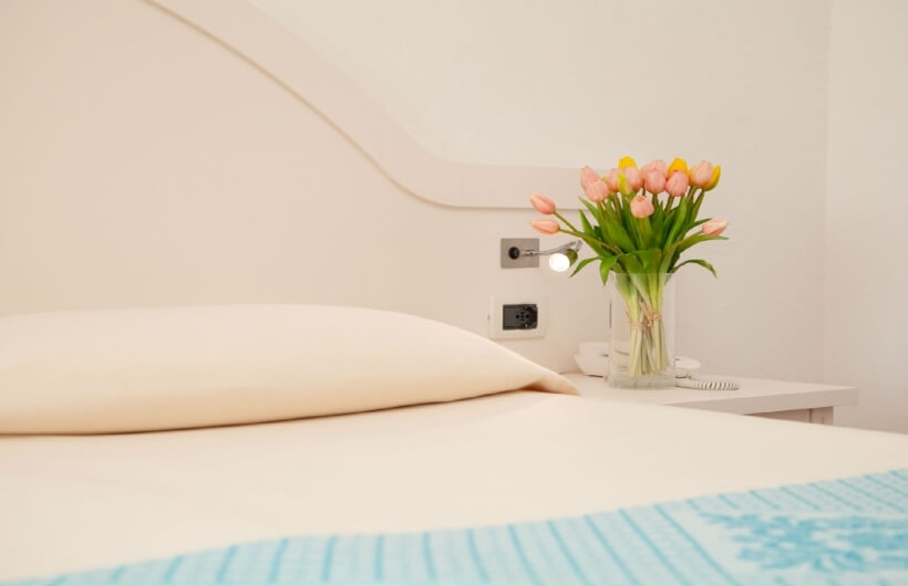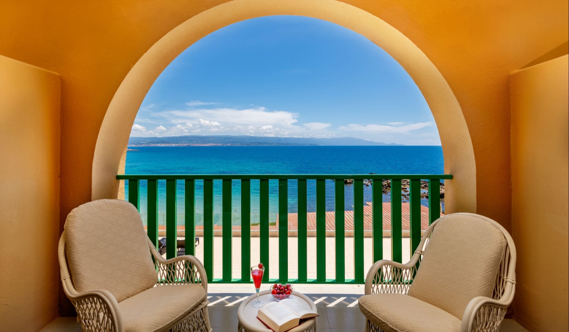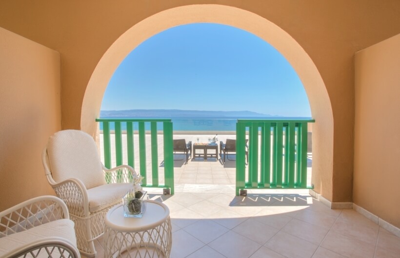 On the first floor, on the sea-facing side, along with the private veranda, certain rooms also have access to a large shared solarium, featuring rattan sun loungers.